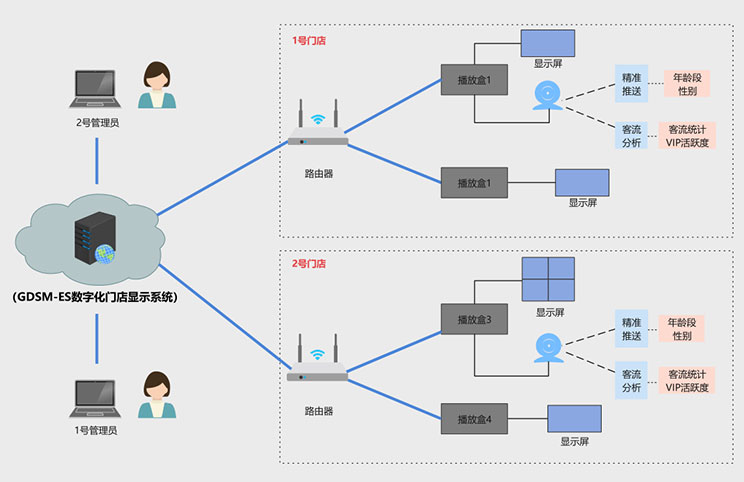 该客户为宁波地区零售门店,在一段时间内,客户发现门店销售额持续下滑,但是不知道原因出在哪里,到底是消费者减少,还是广告推送出现问题,亦或是其他原因,客户没有头绪,JDB电子科技数据化门店显示系统完美的解决了客户痛点,方案拓扑图如下: