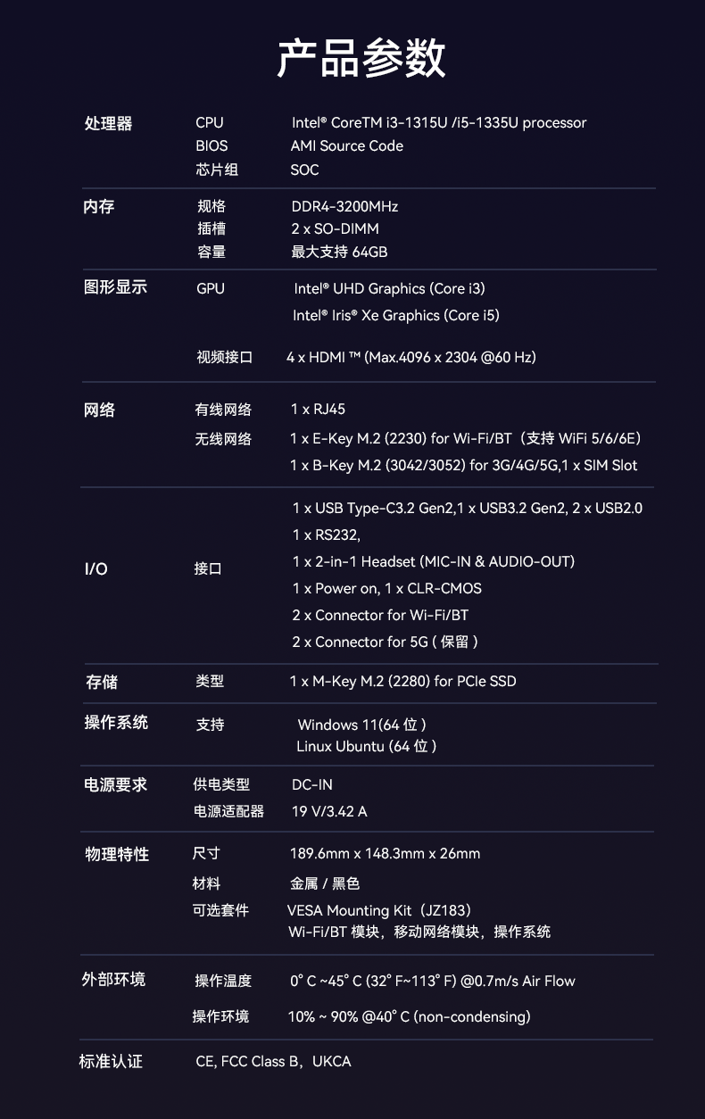 JDB电子科技D613采用英特尔Raptor Lake酷睿i3-1315U/i5-1335U 处理器,作为一款性能强悍的主机,它的TDP仅15W,能有效降低能耗,延长电池寿命。在内存方面,D613采用2 x SO-DIMM DDR4-3200 MHz,最大可达64GB,并配备1 x M-Key M.2 (2280) for PCIe SSD。
