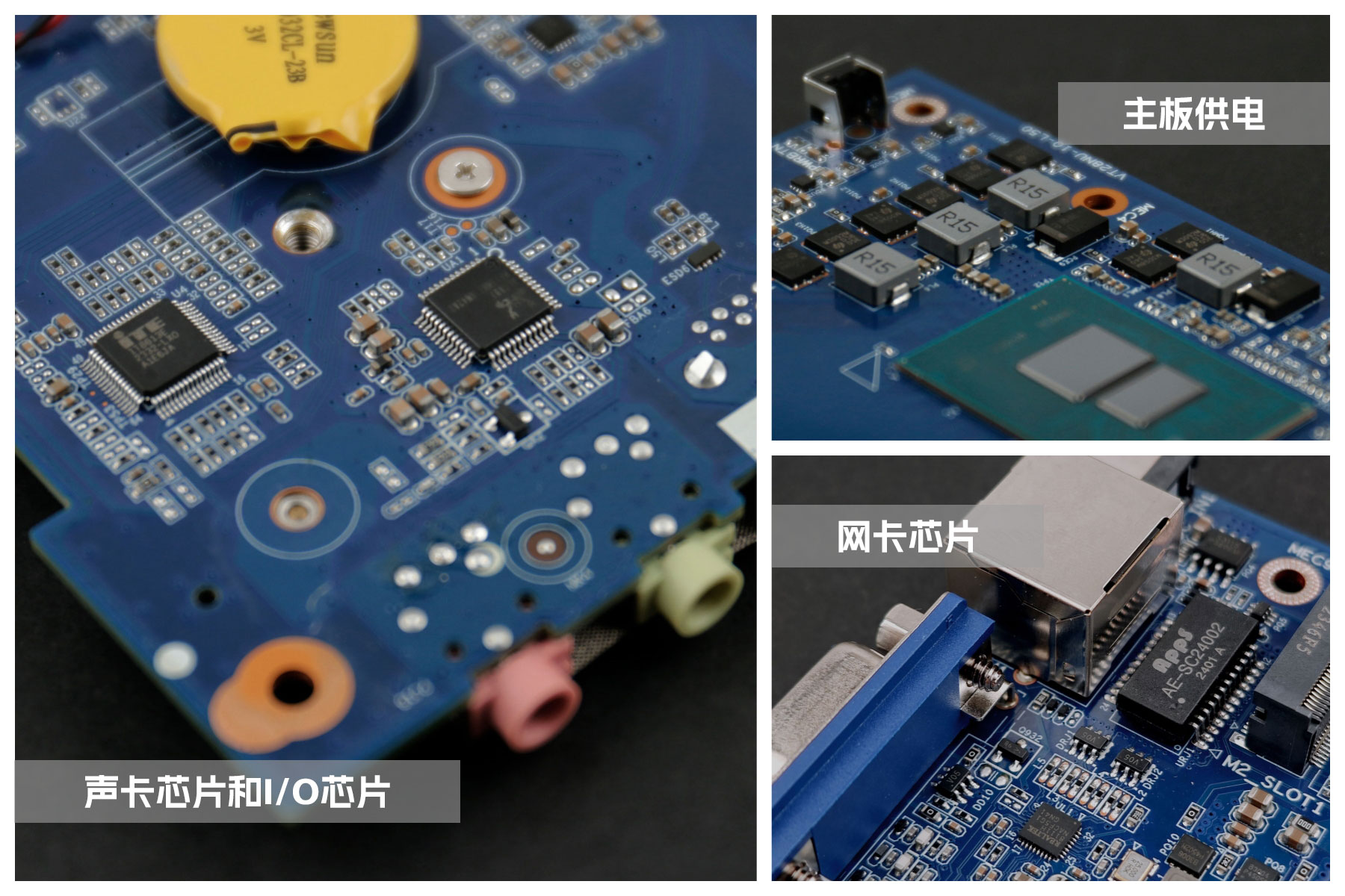 JDB电子桌面云终端Y-BOX S2主板采用的是3+1相供电,在主板两侧的接口附近,都分布了相关的芯片。在千兆网口附近有1个网卡芯片RTL 8111H,在主板背面的音频接口附近可以看到一个经典的“小螃蟹”ALC897 声卡芯片,声卡芯片附近有一个I/0 芯片HE8613E-LX。