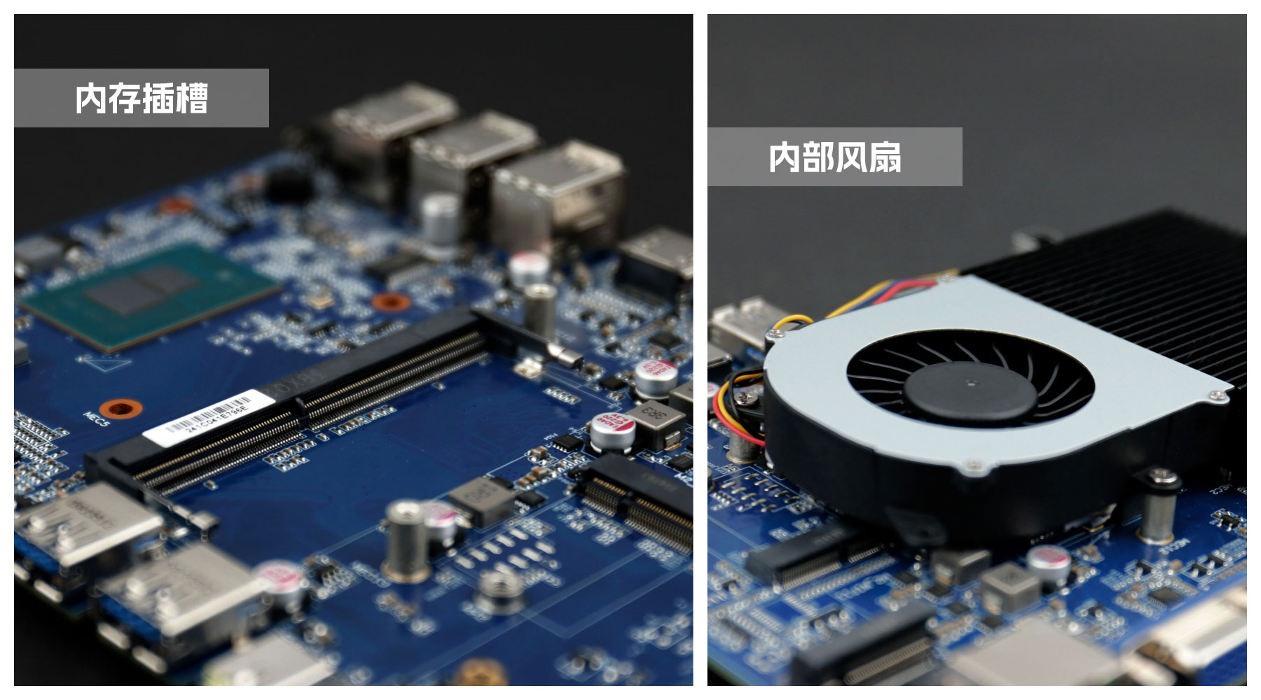 JDB电子桌面云终端Y-BOX S2主板中部是内存插槽,采用单通道笔记本内存槽设计,最大支持容量可达32GB,最高支持DDR4-3200MHz频率,横插的形式可以减少主板的占用体积,使整体机身更紧凑,内存顶部的风扇起到高效散热的作用。