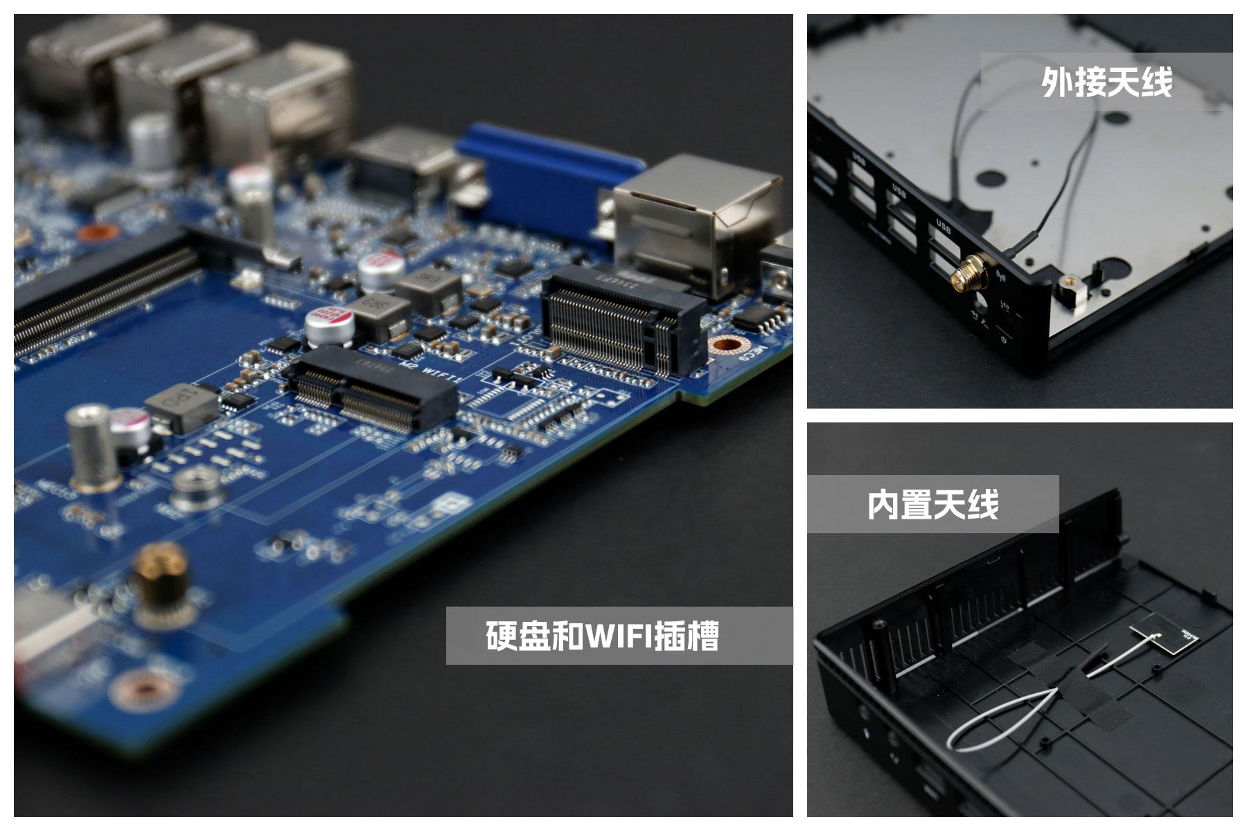JDB电子桌面云终端Y-BOX S2主板上配备了 1个 M.2 固态硬盘位,接口规格为 PCIe3.0 标准,匹配标准的 2280 规格硬盘。一侧还有一个M.2接口,匹配2230长度的WIFI/BT模块插槽,WiFi模块可以连接的是外接天线,增强信号,同时也可以内接天线,灵活应用,支持Wi-Fi 5/6/6E网络。