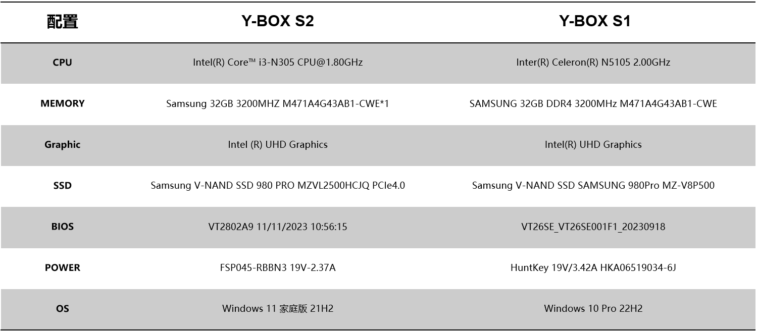 针对桌面云终端Y-BOX S2的测试项目中,最值得关注的是性能测试的跑分数据和稳定性测试内容,这能直观影响主机在使用过程中的稳定性和用户的使用体验。针对性能测试,JDB电子选择了将Y-BOX S2与前一款更迭产品Y-BOX S1进行对比分析,Y-BOX S2支持Intel® Alder lake-N处理器,Y-BOX S1支持Intel® Jasper Lake,并分别选取了以下配置: