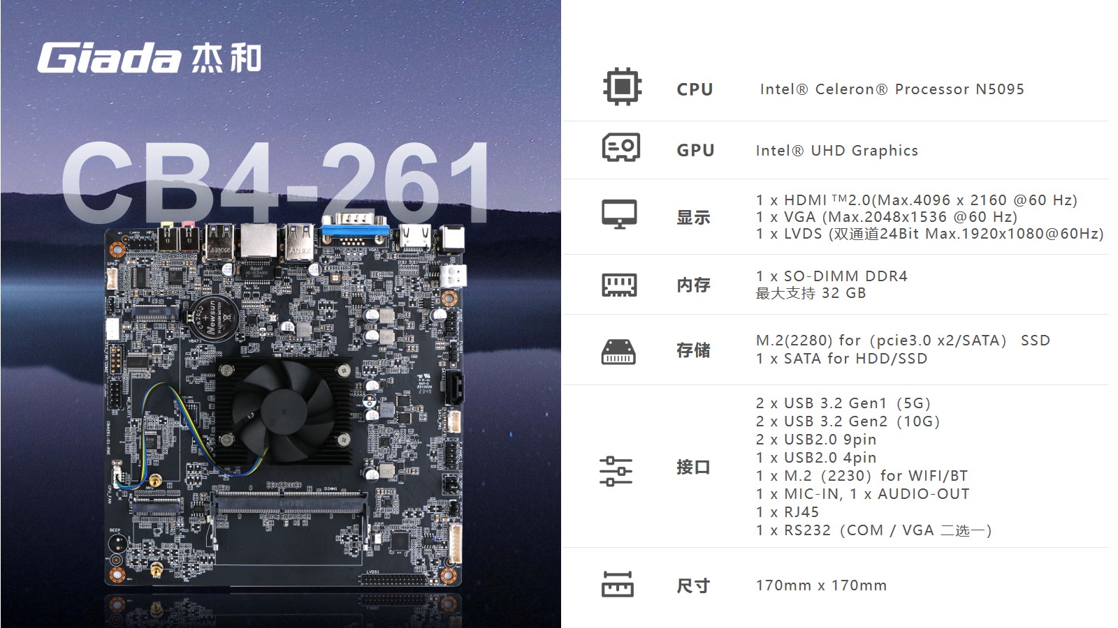 JDB电子科技CB4-261尺寸仅有170x170mm,小而精巧。搭载N5095芯片,该芯片采用10nm制程技术,四核心设计,支持Windows 、Linux系统,可满足多种终端机应用场景的需求,如信息查询、基本数据处理等。