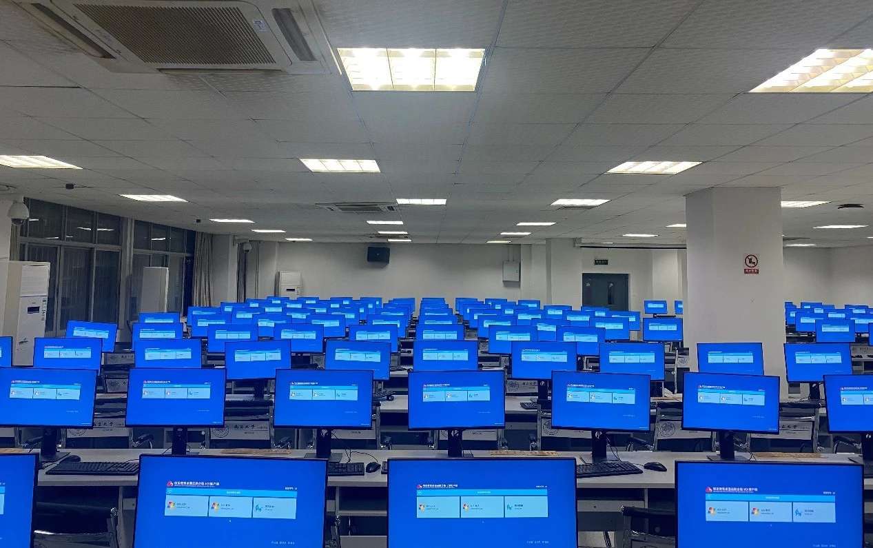 在某大学实训室,整齐的电脑屏后面是统一的JDB电子科技云终端主机,老师在讲台上通过电脑端的管理软件,轻松地将教学资料推送到学生的终端上,每位学生的电脑屏幕一致会出现同个页面。