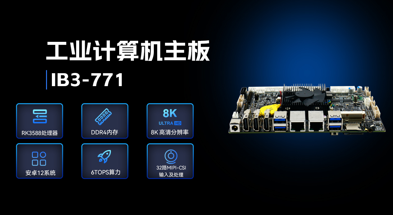 ARM主板IB3-771采用瑞芯微RK3588处理器,满足各种人工智能场域对工业主板:高算力、低功耗、高扩展性、高可靠性、高安全性等要求,IB3-771支持在宽温、复杂电磁等恶劣环境下稳定运行,可广泛应用于机器人、边缘计算、智能NVR、智能汽车、智慧大屏、AR/VR、智能自助终端等AIoT行业类应用市场。