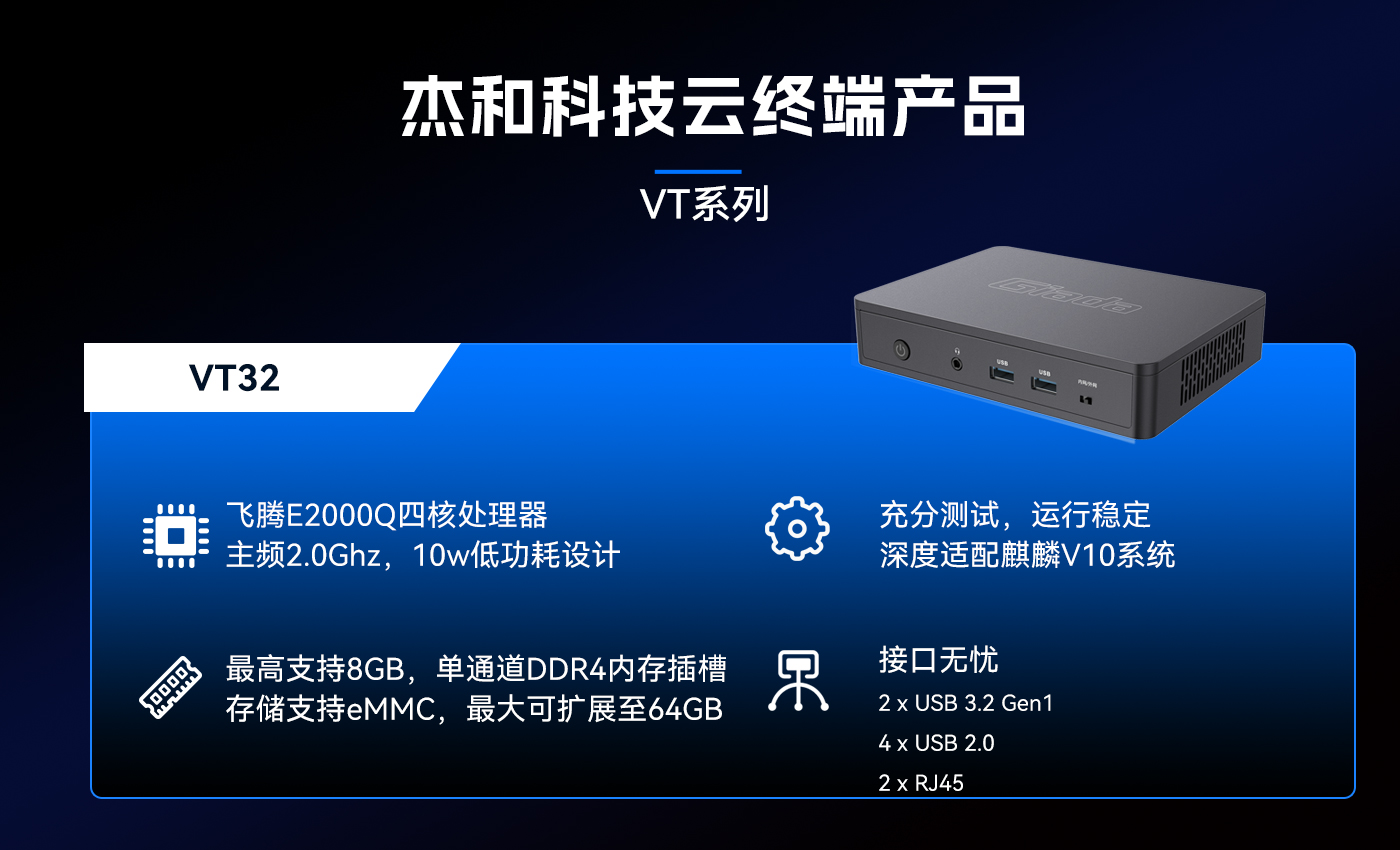 为响应信创趋势,JDB电子科技推出了搭载国产芯片—飞腾E2000Q的云终端VT32,VT32与麒麟V10操作系统进行了深度适配,为用户打造出更加安全可信的解决方案。