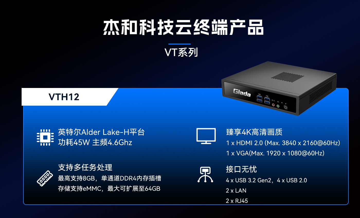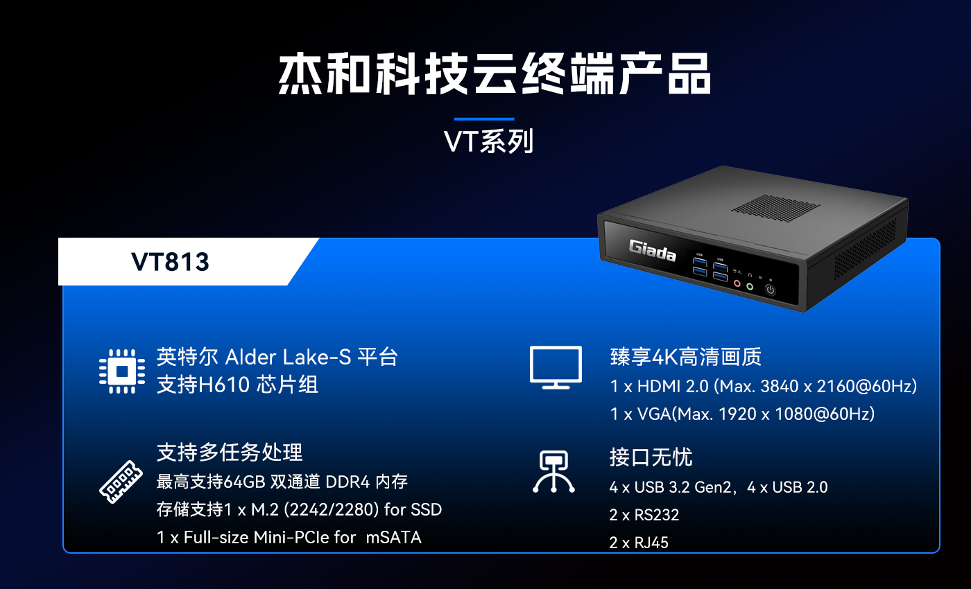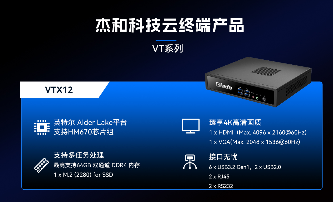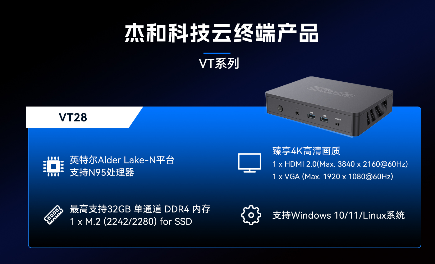 除此之外JDB电子科技云终端VT系列产品线还提供多样化的硬件配置选择,涵盖多种处理器架构、内存容量、存储设备和接口类型,满足不同应用场景的个性化需求。