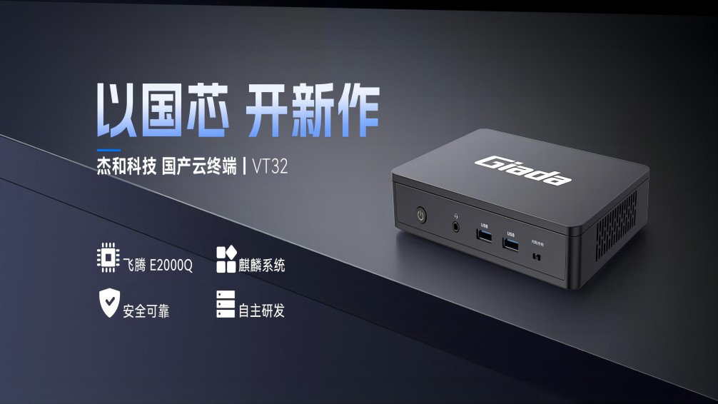 JDB电子科技推出的国产化云终端VT32,这款产品采用国产飞腾腾珑E2000Q四核处理器,主频达2.0GHz深度适配银河麒麟V10系统,麒麟V10系统不仅能满足金融办公、政府办公对于数据安全与隐私保护的要求,还支持多样化部署与管理。