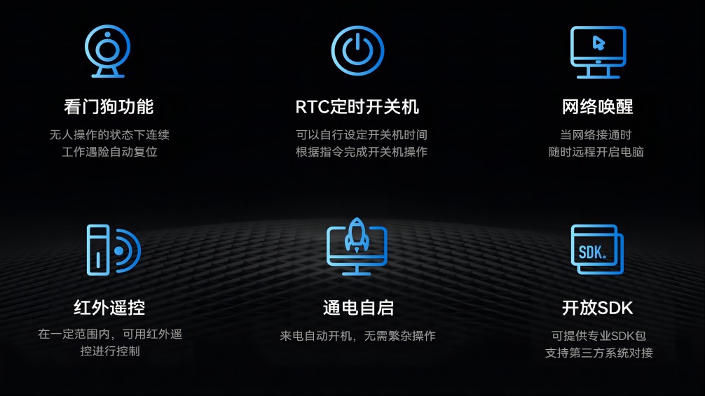 除了强大的硬件性能和广泛的应用场景外,AF208还支持JAHC(JDB电子主动硬件控制技术),JAHC是高可靠无人值守系统,是由JDB电子科技自行定义开发的一套结合了软硬件的控制系统,该系统是JDB电子科技完全自主研发,包含上电自启,复杂逻辑定时开关机,软件看门狗、断电恢复后网络唤醒功能,宕机自动重启以及红外遥控等智能功能,进一步提升了其在工业智能化和自动化控制中的应用价值。