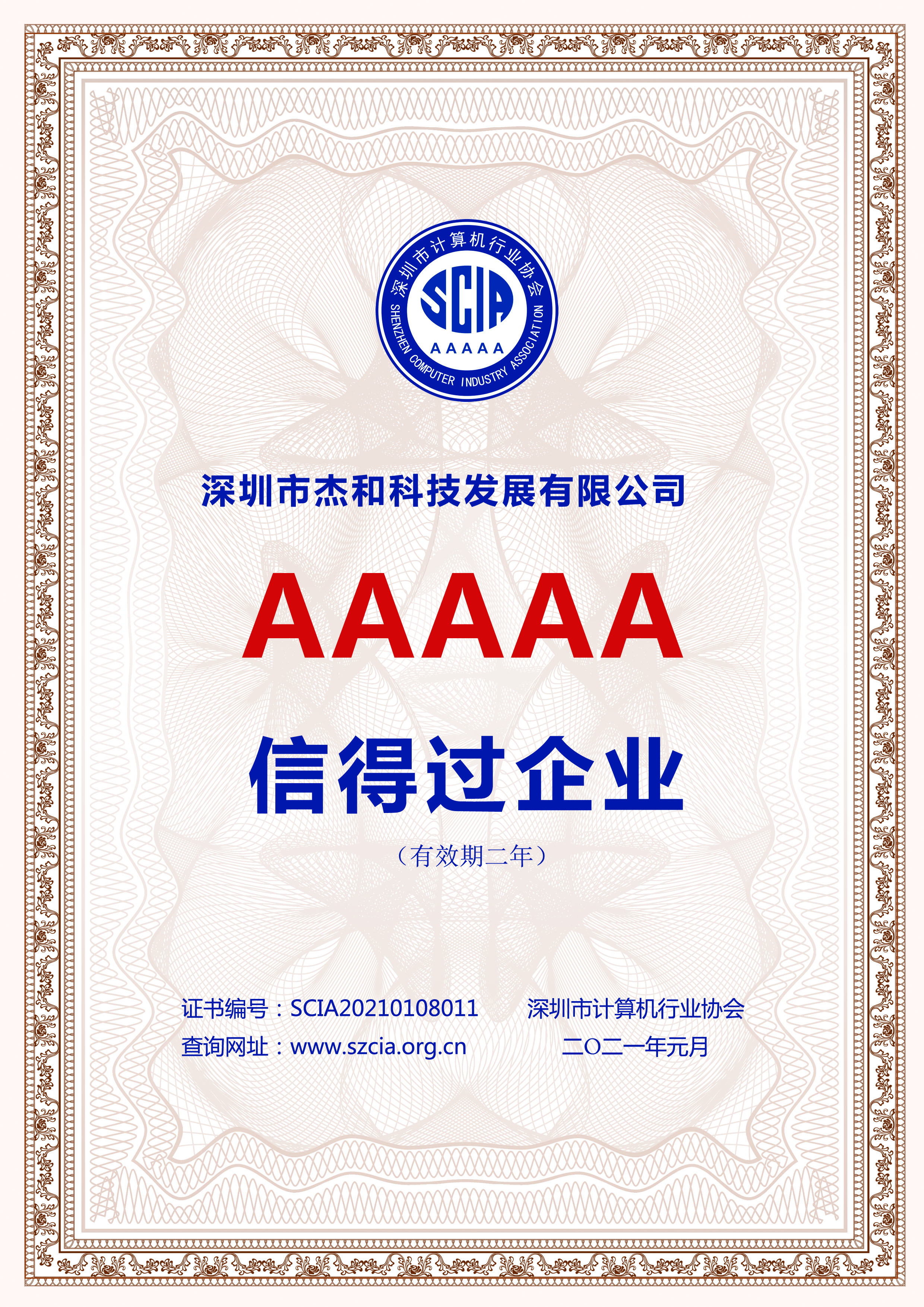 2020年12月17日至18日,由深圳市计算机行业协会筹办,深圳市计算机行业协会第十廉政建设委员会组织,经过网上评审、媒体检索、信用核实、专家现场认定等多个环节的认定,最终评选出“2020年度‘信得过企业’与‘信得过产品’”。深圳市JDB电子科技发展有限公司荣获“5A级信得过企业”评价!