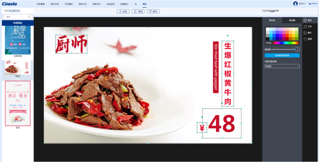 JDB电子科技智慧餐厅综合解决方案是由智能零售管理系统搭载公司自研的数字标牌播放器组成的软硬件一体化方案。该系统针对餐厅、酒店等不同行业提供典型节目模板,支持手机、电脑建议操作。用户只需3步即可完成节目的制作播放:选择节目模板,更换自己的素材(视频、图片和文字),预览保存及播放。价格、优惠折扣等信息可随时更改。