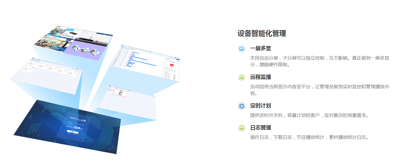 系统拥有自由分屏功能和触屏互动功能,实现一台设备同时播放不同内容,支持图片、视频、文字、动画、音乐、浏览器等多种形式内容,可在学校大屏上分屏展示各种信息。如结合触摸屏,则可以使用触屏互动功能,学生、教师、来访人员等可自主点击查看相关信息,更加灵活便捷。