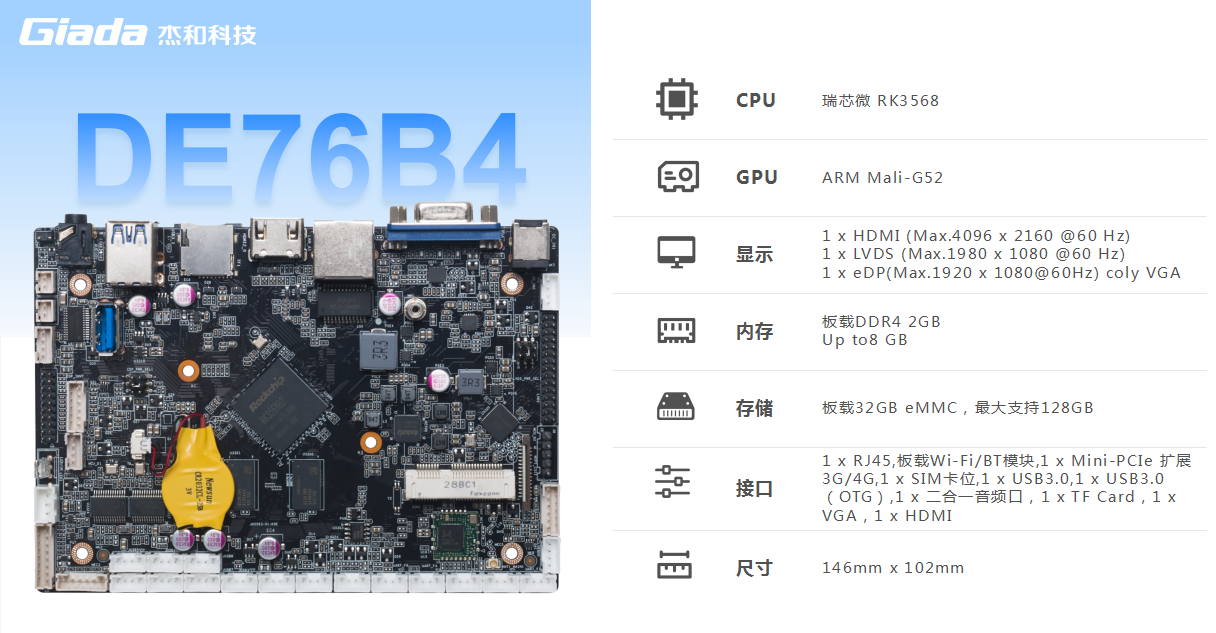 “AIoT”指的是人工智能技术与物联网在实际应用中的落地融合,实现人,流程,数据和事物互联互通的万物智慧互联。而在丰富的AIOT技术应用场景中,对计算机硬件的数据运算、存储能力,稳定性及可扩展性能等要求更高,GiadaJDB电子科技作为行业领先的物联网数智化技术服务商,深入布局AIOT领域,推出了基于ARM架构的3.5寸嵌入式主板DE76B4。