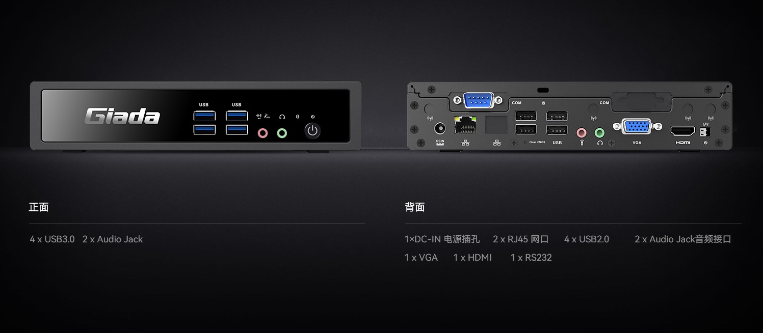 JDB电子云终端BW612机身背面配备四个USB2.0接口,两个3.5mm 音频接口,两个千兆网线接口,一个VGA和 HDMI 接口,兼容几乎全部主流外设,满足云终端全场景接口使用需求,同时正面配备两个3.5mm音频接口,四个USB3.0接口,满足即插即用的设备需求。