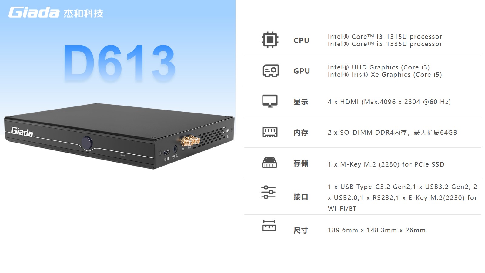 JDB电子数字标牌D613搭载Intel RaptorLake Corei3-1315U/i5-1335U处理器,可以同时连接4个4K显示器,支持4K分辨率编码解码,还支持5G蜂窝网络,速度比4G LTE快10倍。