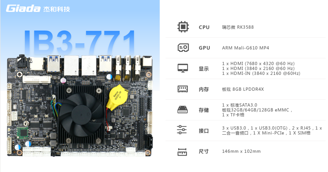 JDB电子主板IB3-771搭载瑞芯微RK3588八核64位处理器,内置6TOPS算力的NPU,具备高算力、内存大、超强多媒体、多重扩展等技术优势。满足8k超高清视频的显示需求,还支持主流深度学习框架,为各类 AIOT 应用场景提供更优的性能表现,支持机器人、边缘计算、智能NVR、智能汽车、智慧大屏、AR/VR、智能自助终端场景的广泛应用。