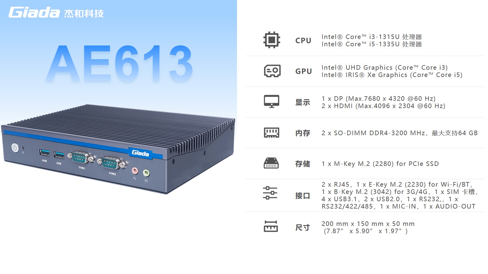 JDB电子AE613拥有2 x SO-DIMM DDR4-3200 MHz内存、1 x M-Key M.2 (2280) for PCIe SSD存储,最大支持64GB,无论是处理复杂的多任务环境、还是运行高负载的软件都游刃有余。