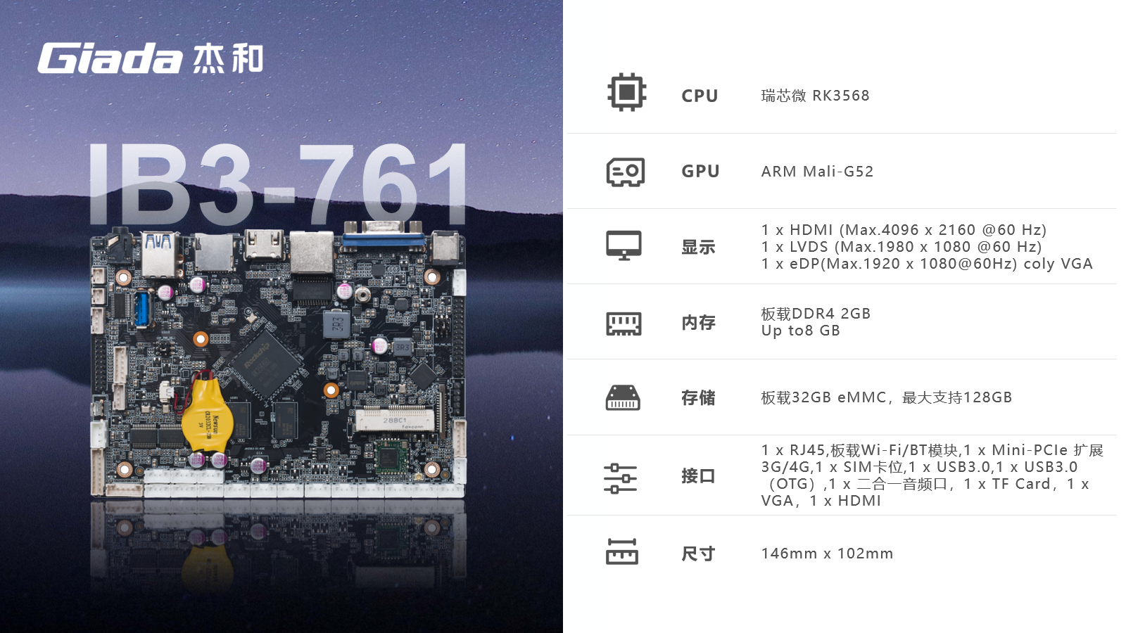 JDB电子ARM主板IB3-761基于瑞芯微RK3568四核64位处理器开发,可实现多任务并行、更大数据集的高效处理,丰富的接口,具有性能强、内存大、集成度高、扩展能力强等特点,在处理速度和图形处理能力方面都表现出色,可广泛应用于物联网网关、边缘存储、工控平板、工业检测、工控盒、自助终端、云终端、车载中控、机器人等行业定制市场。