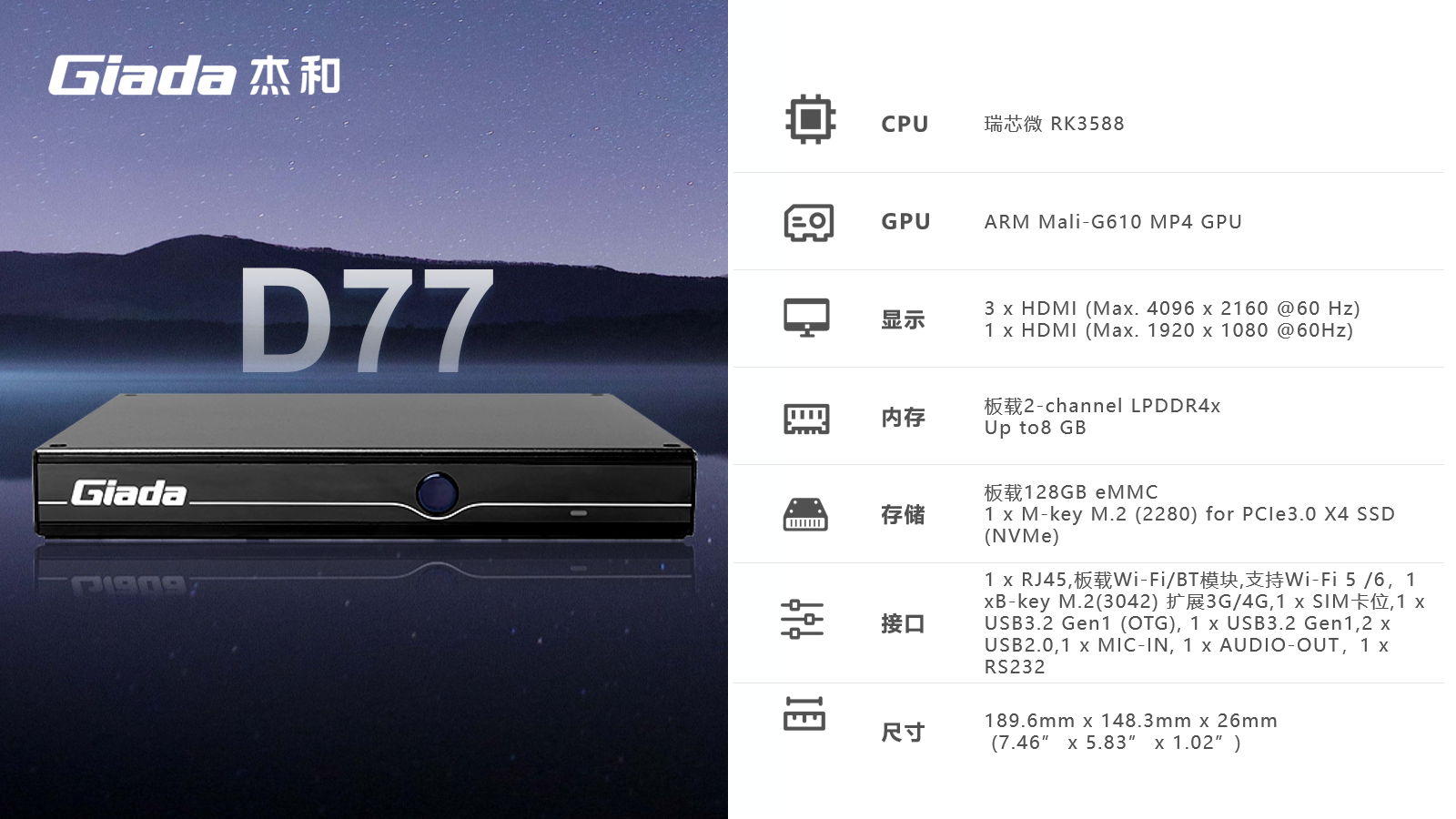 AIoT的落地场景包括智慧工业、智慧零售、智慧社区、智慧城市、智能显示、医疗健康等领域,在实际落地时,对物联网硬件设备的AI算力、数据运算、存储能力,稳定性及可扩展性能等提出更高要求,GiadaJDB电子科技作为行业领先的物联网数智化技术服务商,深入布局AIoT领域,推出AI产品系列,包括3.5寸主板、嵌入式整机、边缘计算盒子等,全方位覆盖了入门级到高性能级,满足不同应用场景的需求,为用户赋能。
