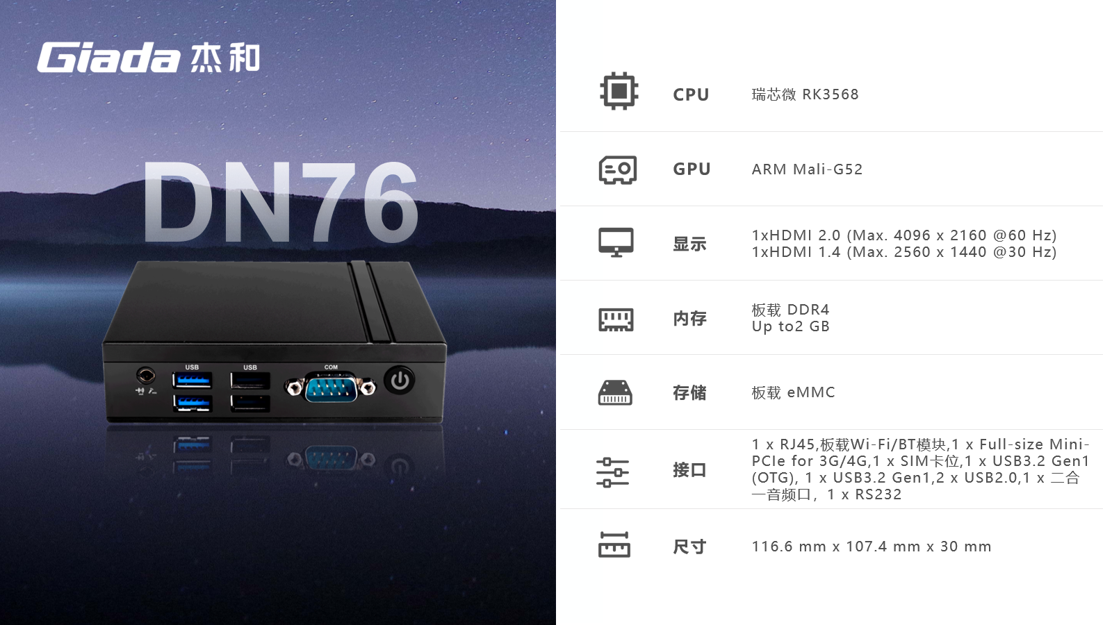 JDB电子媒体播放器DN76采用瑞芯微RK3568 ARM嵌入式方案,作为一款超紧凑的安卓播放器,内置一个独立的NPU,计算能力为1TOPs,可用于轻量级AI应用程序,支持HDMI双显,优秀的散热设计,超高性价比,得到广大用户的喜爱,可以广泛应用于商业显示、智能车载、安防领域和边缘人工智能等场景。