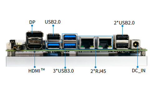 最大可支持32GB内存,配备2个SO-DIMM DDR4插槽,支持1个M-Key M.2(2280)插槽用于PCIe SSD、1个2.5英寸SATAIII接口,1个eMMC5.1(可选)以增加存储。