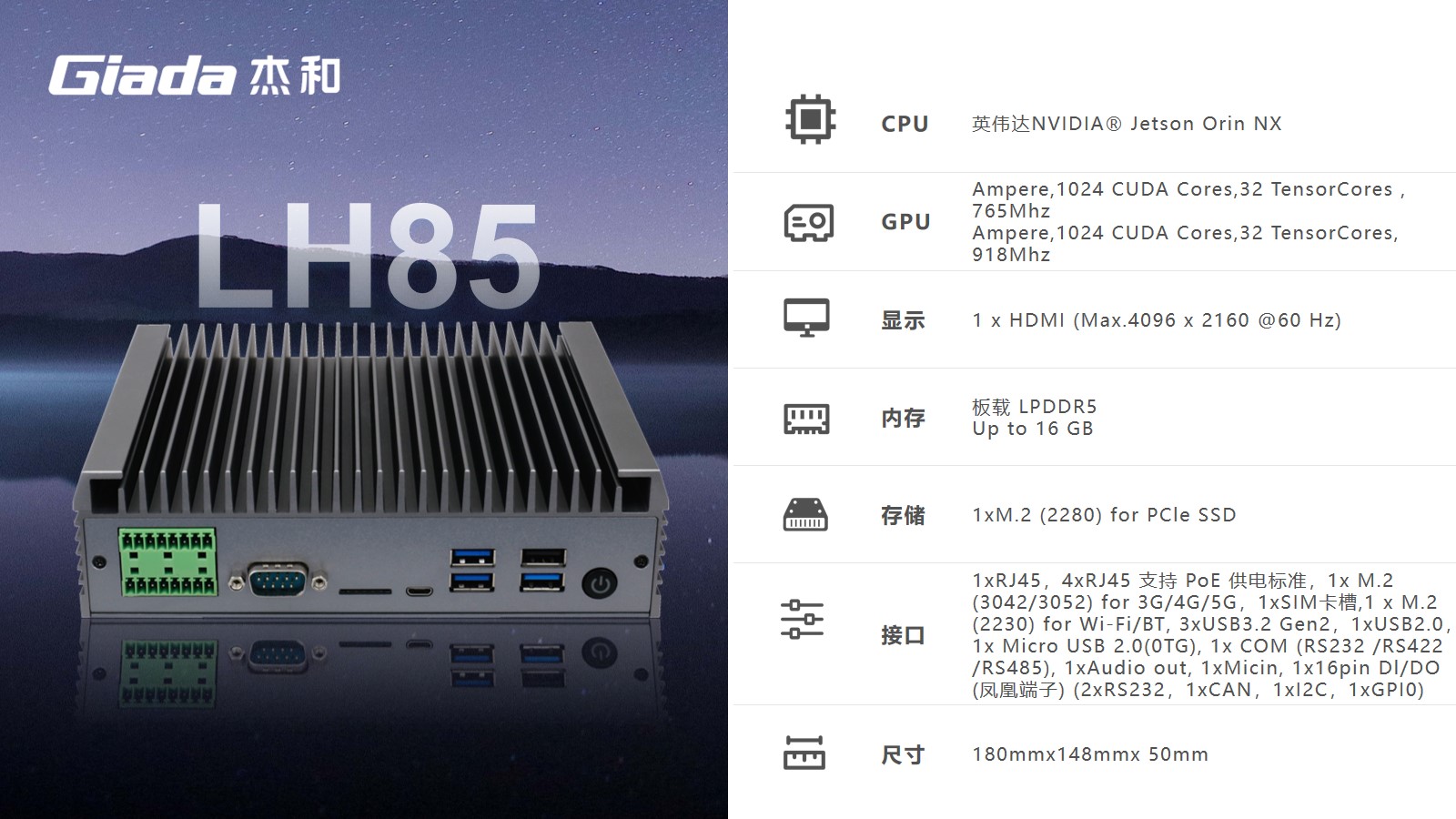 JDB电子科技AI边缘计算LH85,拥有100TOPS超强算力,能为工业控制领域客户的AI应用提供强大的算力支持和充足的通信、控制接口保障,可广泛应用于智能制造、机器视觉、AGV、智慧城市等领域。