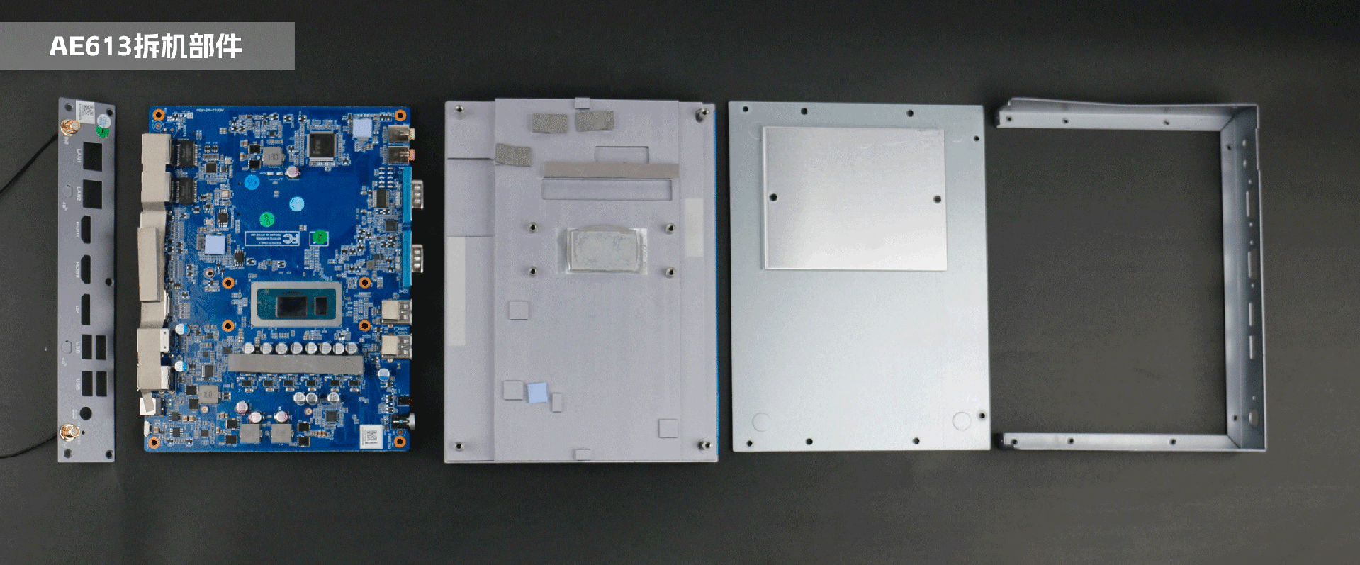 JDB电子AE613采用密封设计,整机由上至下主要分为四个部分:鳍片顶盖、内部主板、四周边框、底盖,机壳外框与主板之间无缝衔接,采用紧凑式设计,能够更有利于导热和散热。顶盖与主板之间贴隔着导热胶与防静电泡棉,用于导热和防静电,在主板的处理器部位装备了导热板和散热膏,提高散热强度。