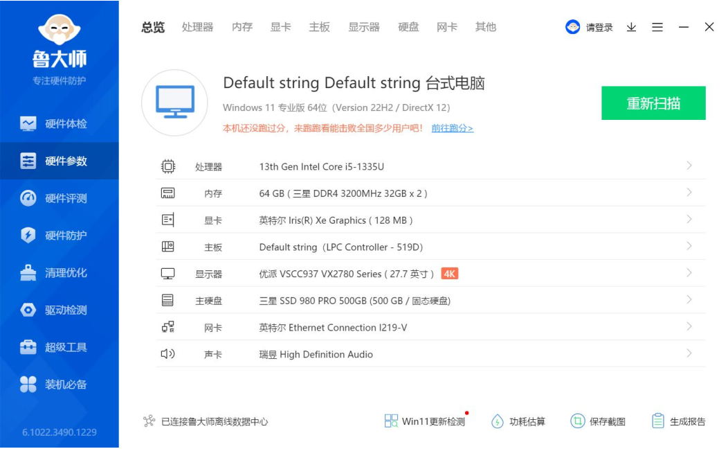 上面是鲁大师识别的JDB电子AE613硬件参数详情,JDB电子进行跑分测试的核心三大件选择的是13th Gen Intel(R) Core(TM) i5-1335U @1.30GHz处理器,Intel(R) Iris(R) Xe Graphics显卡,三星 32GB*2 DDR4 3200MHz内存,三星SSD 980 PRO 500GB(500 GB/固志硬盘),下面JDB电子来看详细的跑分数据。