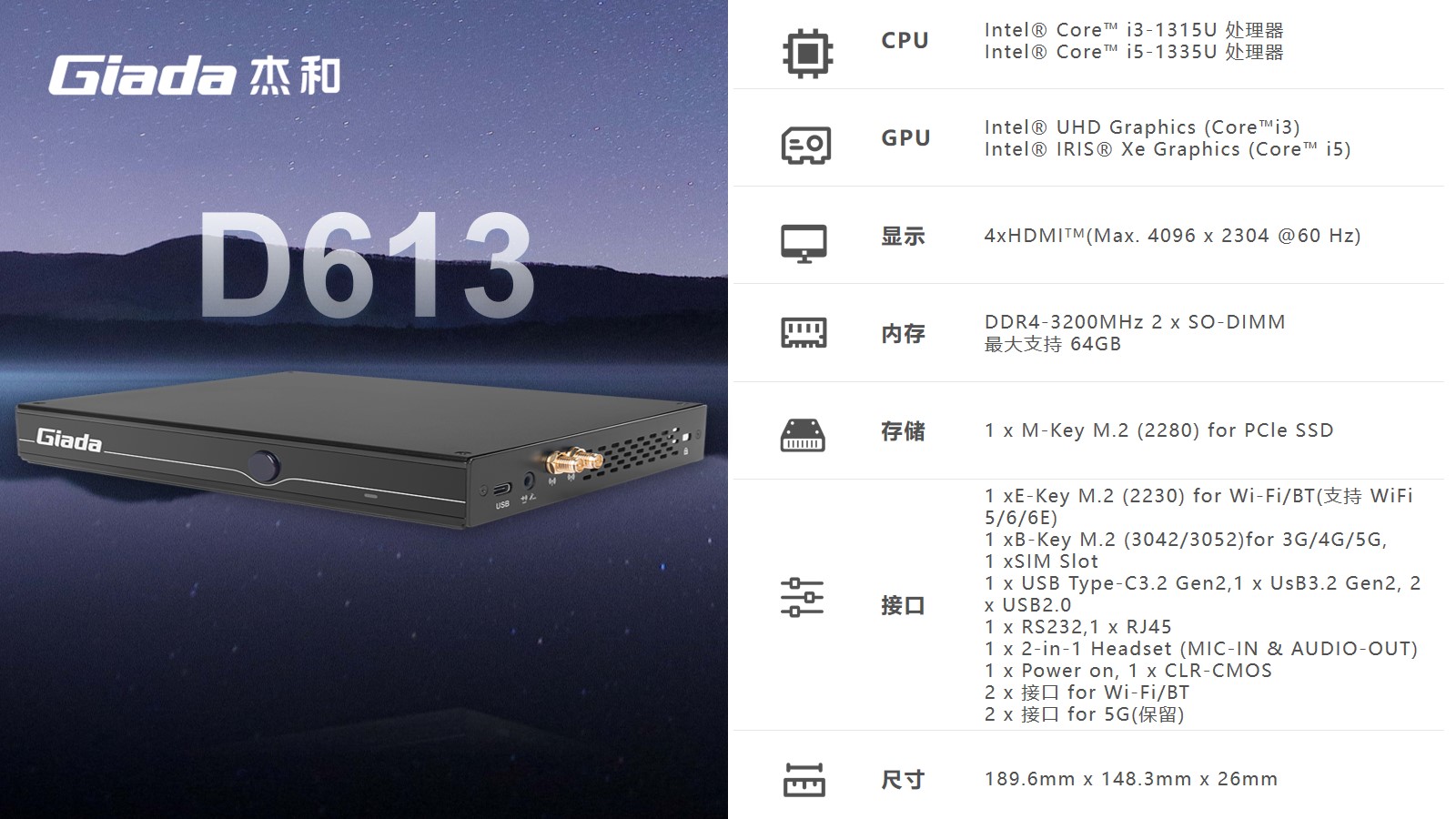 JDB电子科技D613采用Intel®第13代AlderLake处理器i3-1315U、i5-1335,比第11代性能提高19%,Intel® IRIS® Xe GPU (Core i5),图形性能较上一代提升50%。