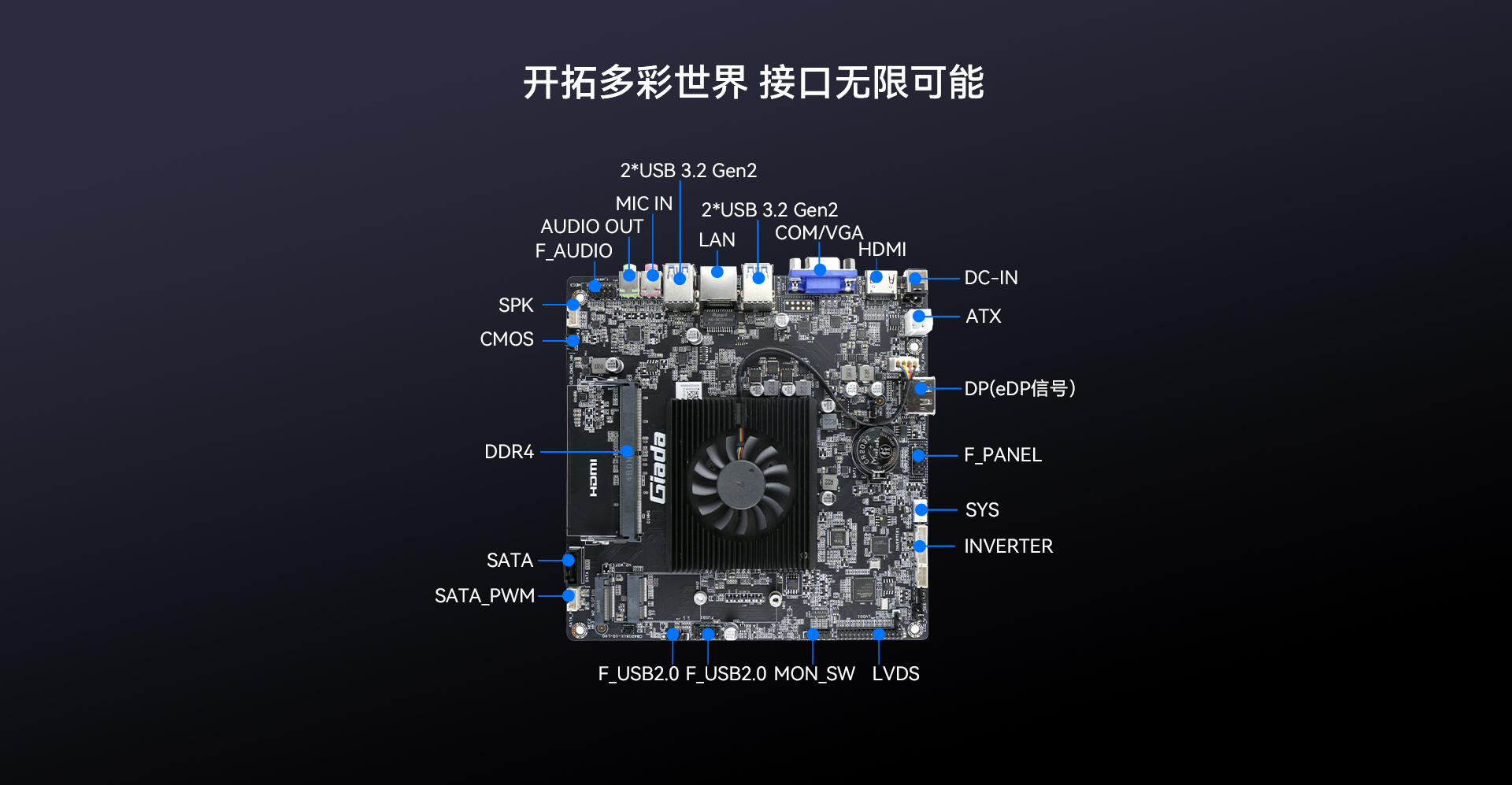 外部I/O | 接口 | 4xUSB3.2Gen2(10G) 1xVGA(Max.2048x1536@60Hz) 1xHDMI™2.0(Max.4096x2160@60Hz) 1xLVDS(双通道24Bit Max1920*1080@60Hz/100Hz/120Hz) 1xMIC-IN,1xAUDIO-OUT 1xRJ45(1000M) 1xRS232(COM/VGA二选一) |